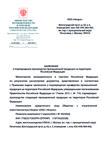 Компания ООО «Неорос» имеет заключение о соответствии производимой промышленной продукции требованиям, предъявляемым в целях ее отнесения к продукции, произведённой на территории Российской Федерации по Постановлению Правительства РФ от 17.07.2015 № 719. Изделия включены в каталог продукции в Государственной информационной системе промышленности.